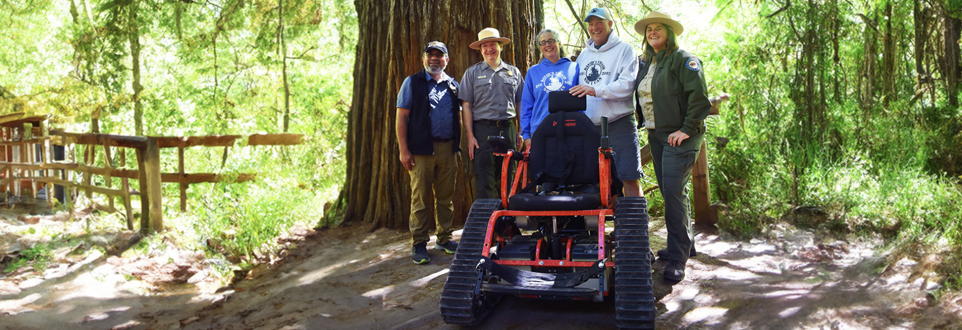 Redwood National and State Parks (RNSP) and Redwood Parks Conservancy (RPC) is excited to announce the arrival of a new Actiontrack electric all-terrain track chair to assist visitors with mobility challenges in exploring the trails and grandeur of the old growth redwood forests of Prairie Creek Redwoods State Park. This new chair has been made possible thanks to a partnership with David’s Chair Outdoor Mobility Systems (David’s Chair) a 501 (C)3 non-profit organization whose mission is “to enrich the lives of mobility impaired people with independence and freedom by empowering them to engage in outdoor activities they previously were unable to, free of charge.”